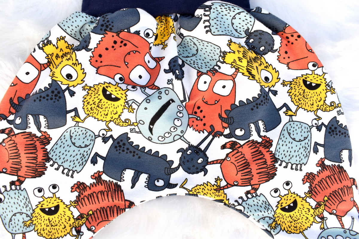 Sarouel évolutif bébé sweat "Monstres rigolos" motifs monstres multicolores sur fond blanc - dispo du 3 mois au 3/4 ans