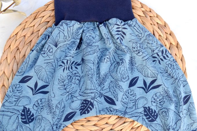 Sarouel évolutif bébé jersey "Singe bleu" motifs singes sur fond bleu - dispo du 3 mois au 3/4 ans
